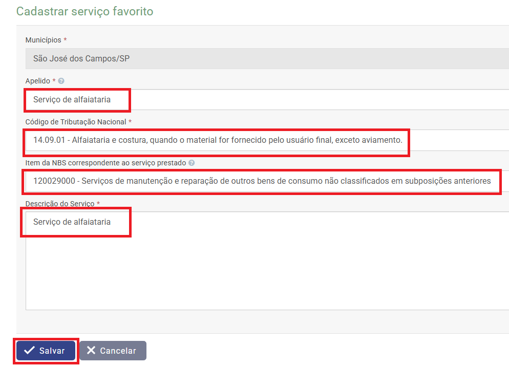 Será necessário informar um apelido para o serviço, selecionar o código de tributação nacional do mesmo, NBS correspondente e inserir uma descrição.