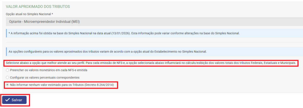• Importante: Selecione a opção “Não informar nenhum valor estimado para os tributos” (pois o MEI paga valor fixo no DAS).